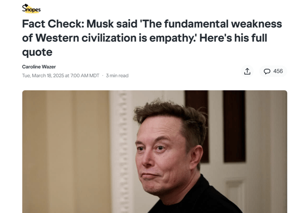 Musk: The fundamental weakness of Western civilization is empathy. The empathy exploit. They're exploiting a bug in Western civilization, which is the empathy response. So, I think, you know, empathy is good, but you need to think it through and not just be programmed like a robot.