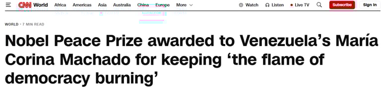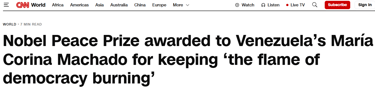 Trump didn't win...The Nobel Committee awards the Nobel Peace Prize to Venezuelan opposition leader Maria Corina Machado... "for her tireless work in promoting democratic rights."